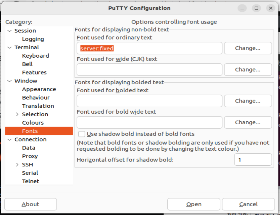 Putty 를 실행하는데 "server:fixed" 라는 폰트를 읽어올 수 없다고 에러가 발생했다.