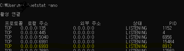 1. 명령 프롬포트(CMD) 에서 netstat -ano 실행.